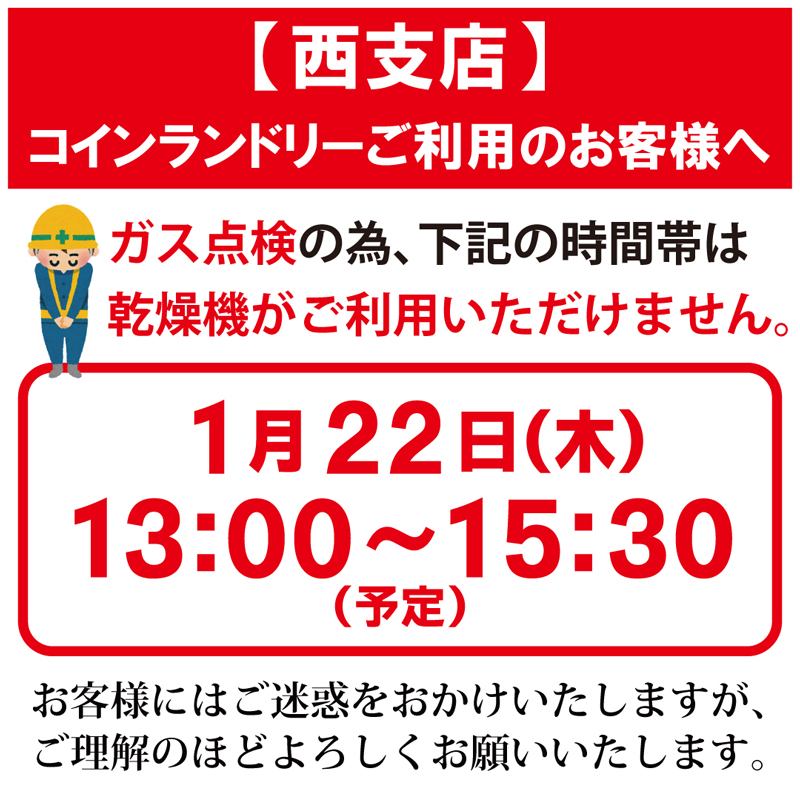 【西支店】1/22(木)乾燥機一時停止のお知らせ2026.01.10