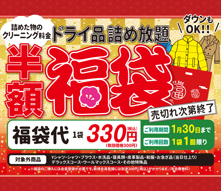 ・当日仕上げ、水洗い品、皮革製品、着物等の特殊品は対象外