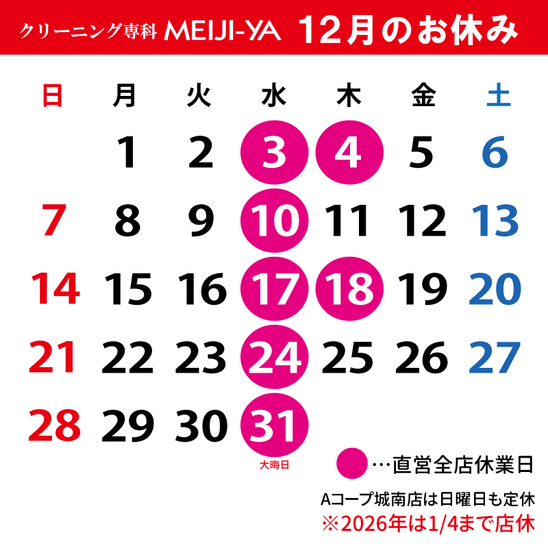 12月の直営店舗のお休みは毎週水曜日と第1・第3木曜、